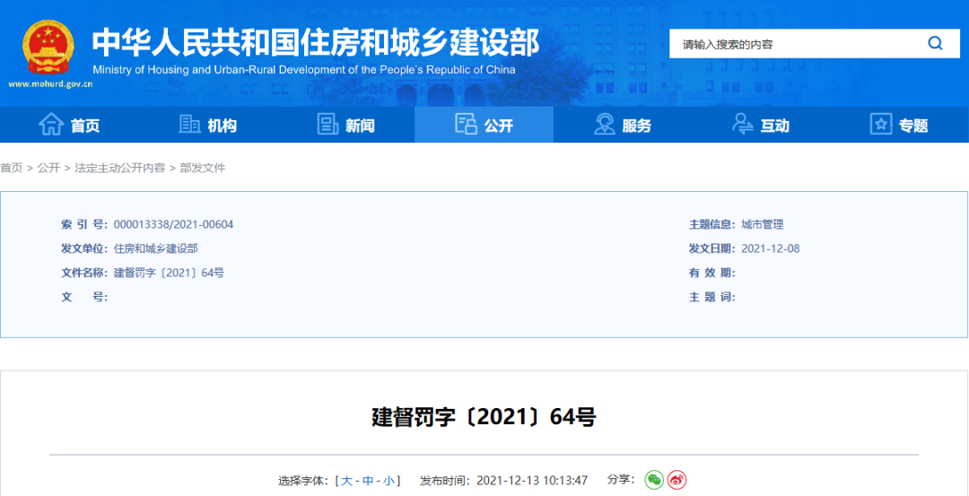 2021年7月2日,住建部下發《建督罰字〔2021〕40號》,追責一起重大工程質量事故,混凝土強度未達標,多棟樓拆除重建,住建部給予施工總承包單位建筑工程施工總承包一級資質降為建筑工程施工總承包二級資質的處罰。
