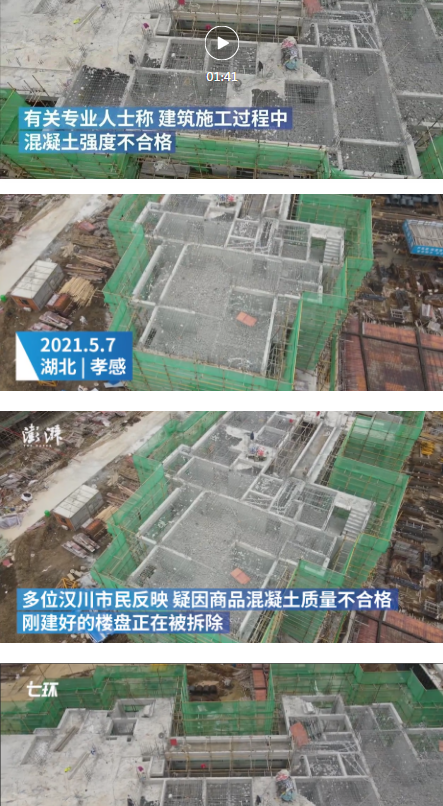 同樣的事情還在湖北發生,2021年5月,因混凝土強度不達標,在建樓盤開始拆除,所涉項目全部停工,負責人被立案查處。