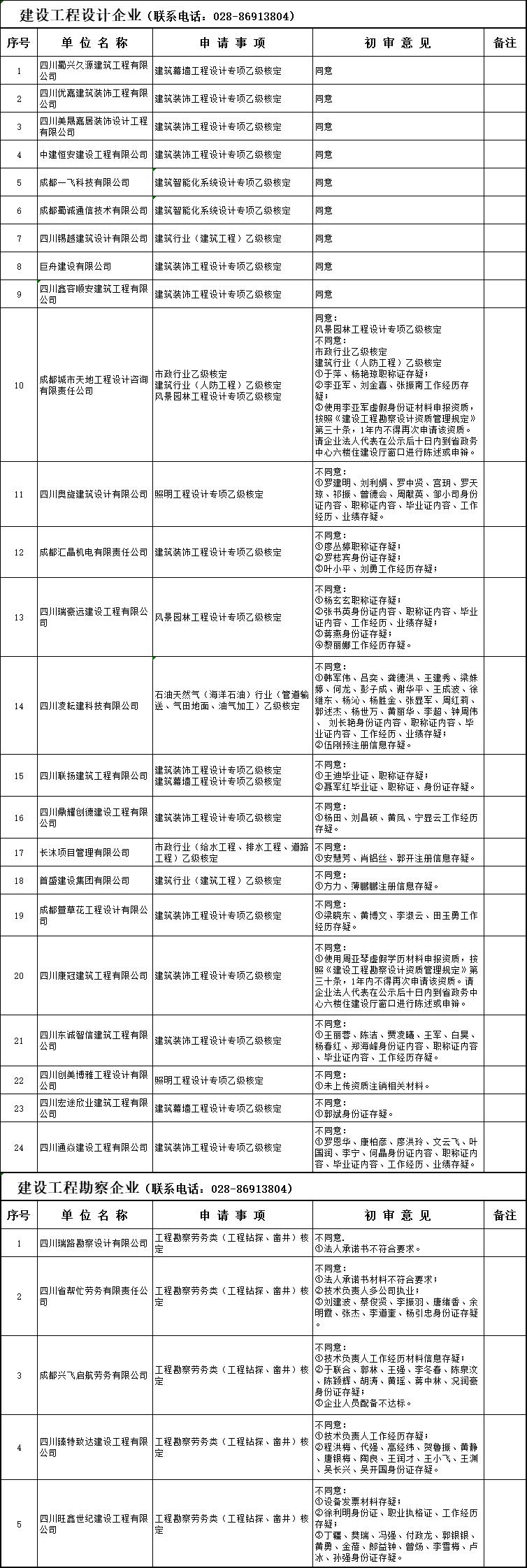 3月30日,四川省住建廳發布《關于建設類行政許可事項初審意見的公示》。根據相關規定,省住建廳對205家建設類行政許可申請人提交的相關材料進行審核,現公示初步審核意見: