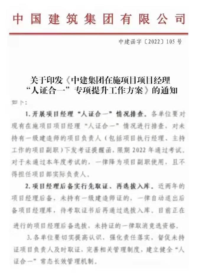 近期,中建集團下發了一份人證合一核查的文件,對于集團內擔任項目負責人(含執行經理)而未持有一建的下發考證提醒函,今年還未通過考試的一律降為項目副職,且不得擔任實際負責人。