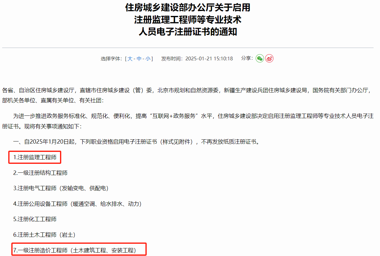 今年1月20號起,7項職業(yè)資格不再發(fā)放紙質(zhì)版證書,全部啟用電子注冊證書,其中包括一造(土建、安裝)和監(jiān)理。