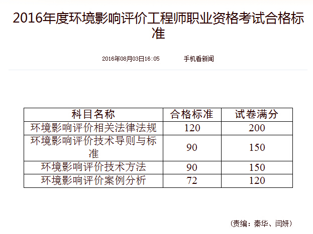 今日,中國人事考試網發布了“2016年度環境影響評價工程師職業資格考試合格標準”,各科合格分數線均為滿分的60%。