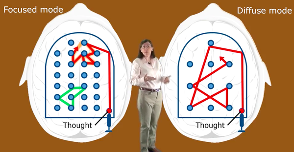 首先介紹人在學習和思考時兩種不同的模式:專注模式 (Focused mode) 和發散模式 (Diffuse mode),專注模式就是集中精力學習或理解某事,只有局部的神經鏈接處于激活狀態,有利于你解決實際問題。比方說你熟悉四則運算,那么解決算數題的時候就主要靠那部分神經出力;而發散模式就是人腦放松的時候,神經信號可以在腦內大面積移動,有利于發揮創造性,比方說你洗澡的時候突然想到一個久攻不破的問題的解決方案。