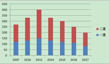 政府層面來講有兩類政策沖擊了傳統的建筑培訓市場,一類是國務院簡政放權背景下出臺的證書新政,另一類是住建系統響應進一步降低市場準入門檻出臺的資質新政。國家的證書新政簡單講就是弱化證書的證明效力,淡化證書的政府背書,將背書主體轉移給社會。很多人對證書新政的精神吃不透,明白我這三個判斷就行了。總體來講不是證書不行了,而是證書的內涵(效力)和外延(適用性)發生了質的變化。住建系統在企業及其從業者個人資質管理上這幾年是走了彎路的。2007年的“八大員”在國務院命令調整后,盡管表面上全系統改變了住建部統一號令天下的局面,但一直到2012年,無論是中字頭的行業協會還是省市的行業協會、住建廳局,都還在或明或暗地大力推進崗位證書,甚至像四川等省份還強化了崗位證書官方色彩。而企業資質在2014年到2015年也被人為地拔高,大有風雨欲來的陣勢。這些悖潮流而動的行為不僅沒有為建筑培訓行業帶來命運的轉折,反而誤導了行業內的主體,大家共同浪費了近10年的時光,耽誤的時機更是無法精確計量了。此為大憾,每念及此,我都感慨不已,人生沒有幾個像樣的十年,十年時光對一個處于高速發展的行業來講也是至關重要的,錯過的或許不是一星半點兒。但好的是,住建系統現在終于艱難地扭轉了政策方向,走在了正確的道路上。企業資質門檻的降低意味著持證人數基數下調,再加上清理掛靠措施并舉,2014年以來一二建考生人數整體上以每年20%的速度下降(中國建設教育發展年度報告,2016)(圖2)。