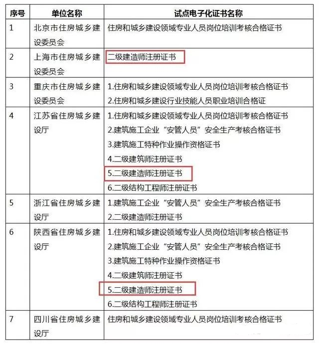 5月23日住建部發布關于同意在部分地區開展住房和城鄉建設領域從業人員有關證書電子化試點的復函,同意北京市、上海市、重慶市、江蘇省、浙江省、陜西省、四川省開展住房和城鄉建設領域從業人員相關證書電子化試點,電子化證書與紙質證書具有同等效力。