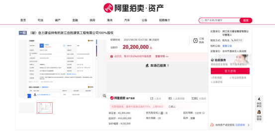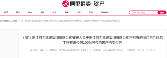 2021年7月24日,浙江自勝建筑工程有限公司(建筑工程一級資質)申請破產清算,并于8月28日在網絡平臺上進行第一次公開拍賣。