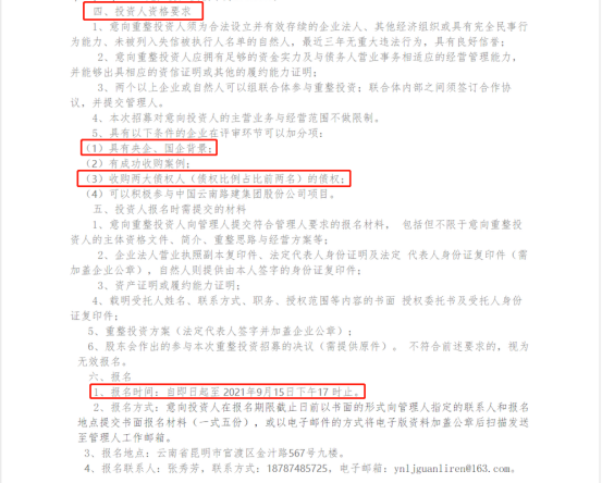 2021年8月13日,中國云南路建集團股份公司(公路工程特級資質)申請破產重整。