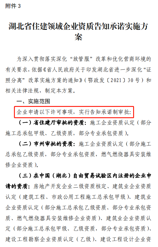 4.建筑業企業資質(附件1)在全省范圍內(含自貿區)實行告知承諾制審批,審批程序按照《湖北省住建領域企業資質告知承諾實施方案》(附件3)執行。