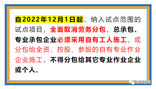 自2022年12月1日起,納入試點范圍的試點項目(主城都市區(qū)政府投資的房屋市政工程以及全市范圍內(nèi)的技術(shù)復(fù)雜項目),逐步實現(xiàn)全面自有工人或自有專業(yè)作業(yè)企業(yè)施工。