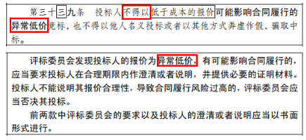 發(fā)現(xiàn)投標(biāo)人的報(bào)價(jià)為異常低價(jià),有可能影響合同履行的,應(yīng)當(dāng)要求投標(biāo)人在合理期限內(nèi)作澄清或者說(shuō)明,并提供必要的證明材料。不能說(shuō)明其報(bào)價(jià)合理性,導(dǎo)致合同履行風(fēng)險(xiǎn)過(guò)高的,應(yīng)當(dāng)否決其投標(biāo)。