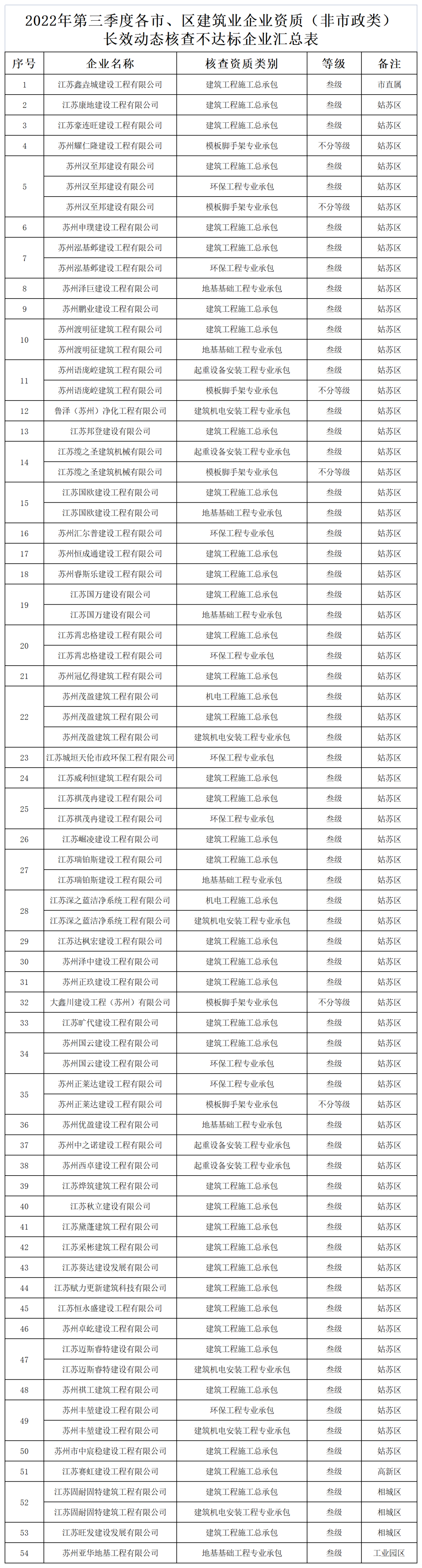 為推進(jìn)我市建筑業(yè)企業(yè)資質(zhì)事中事后長(zhǎng)效監(jiān)管,規(guī)范我市建筑市場(chǎng)秩序,根據(jù)《關(guān)于建立蘇州市建筑業(yè)企業(yè)市級(jí)許可施工資質(zhì)(非市政類)動(dòng)態(tài)核查長(zhǎng)效機(jī)制的通知》(蘇住建建〔2022〕41號(hào))要求,市住建局組織各縣級(jí)市(區(qū))建設(shè)行政主管部門對(duì)轄區(qū)內(nèi)建筑業(yè)企業(yè)資質(zhì)(非市政類)開展2022年第三季度資質(zhì)長(zhǎng)效動(dòng)態(tài)核查工作,現(xiàn)將核查情況通報(bào)如下:
