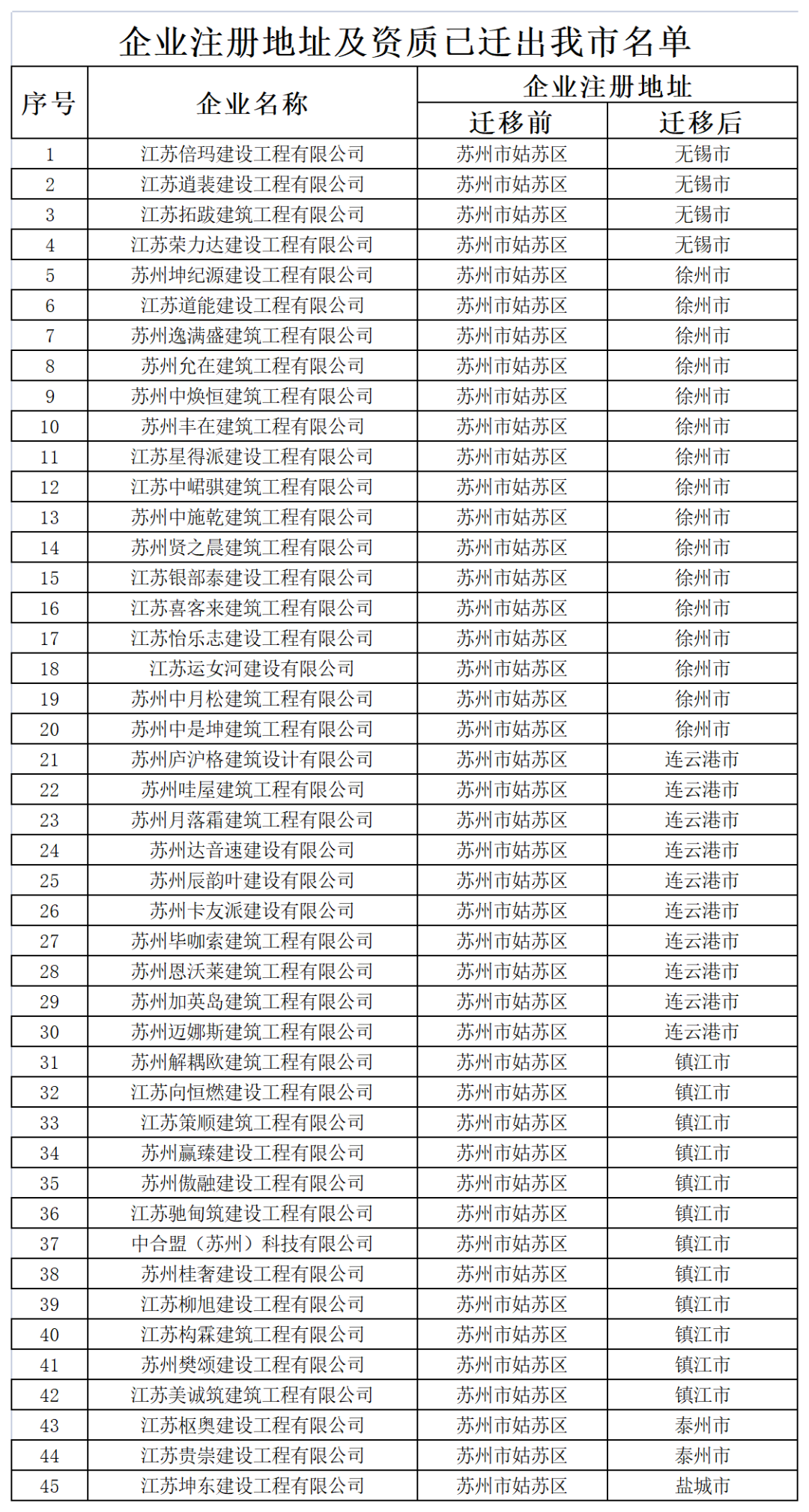 有45家企業(yè)注冊(cè)地址及資質(zhì)已遷出我市;