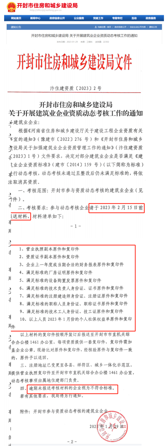 1月29日,開封市住建局發布《關于開展建筑業企業資質動態考核工作的通知》,其中: