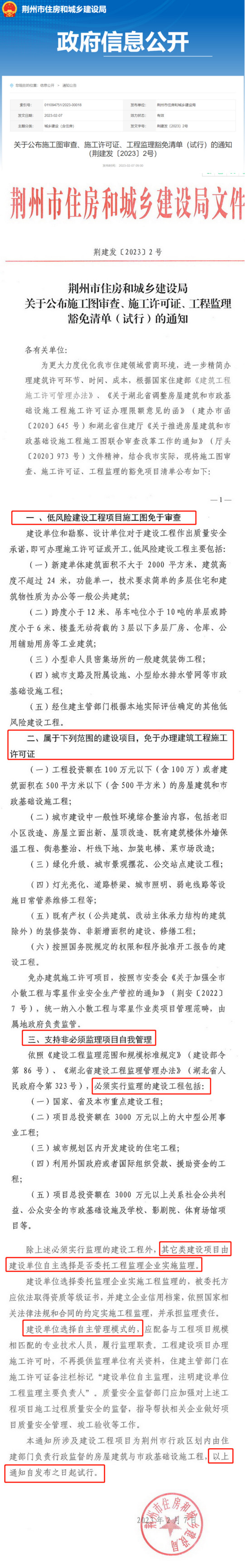 2月7日,荊州市住建局公布施工圖審查、施工許可證、工程監理豁免清單(試行),自發布之日起試行。